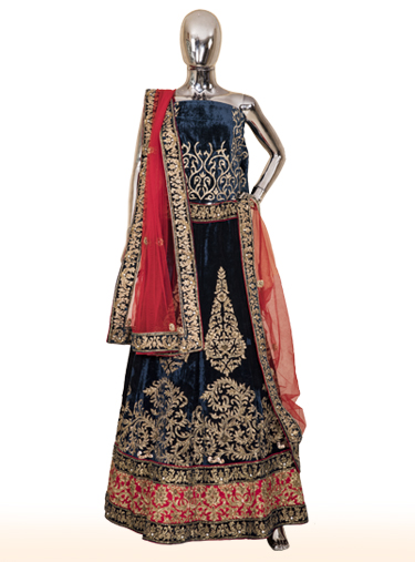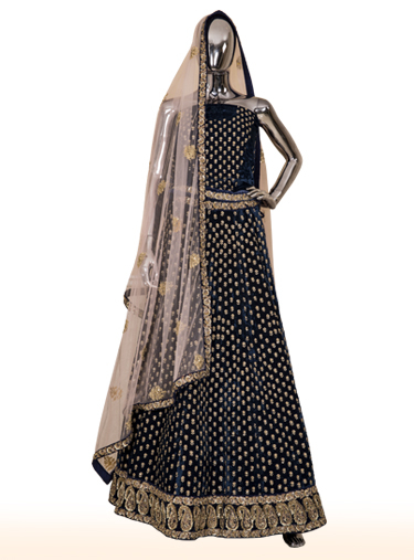 Blue velvet lehenga with fine gold zari