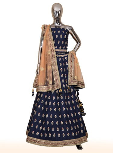 Blue raw silk lehenga with multi