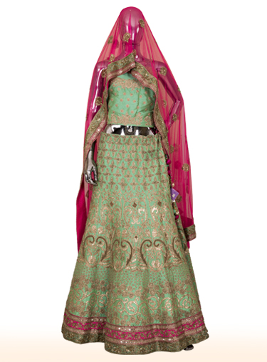 Green raw silk lehenga with antique