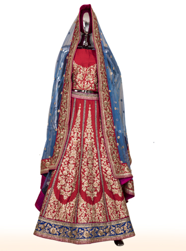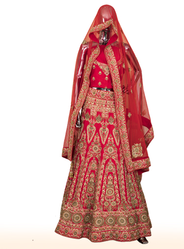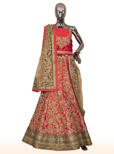 Red raw silk lehenga with dull gold