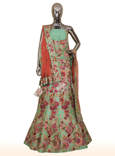 Aqua green raw silk lehenga with multi