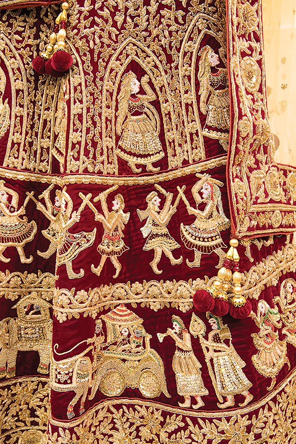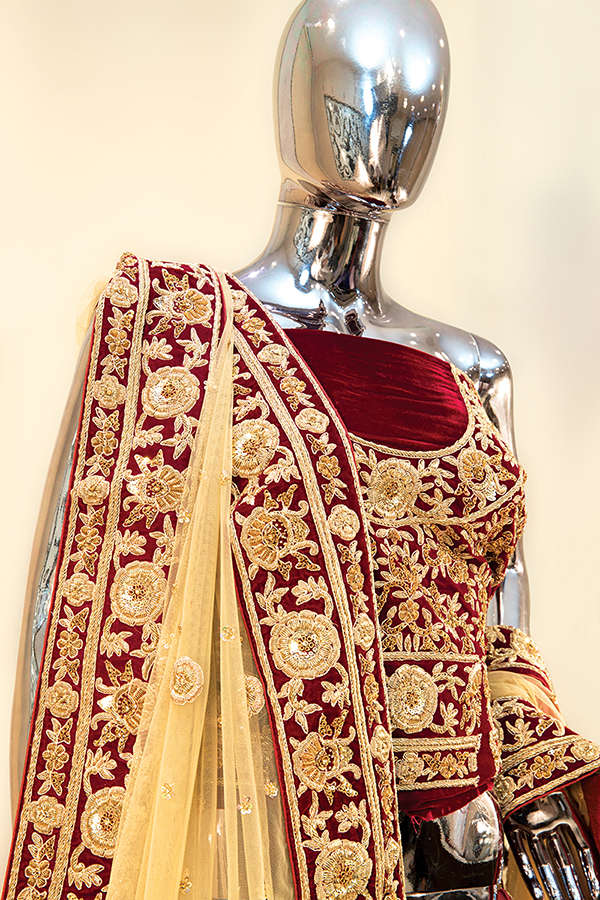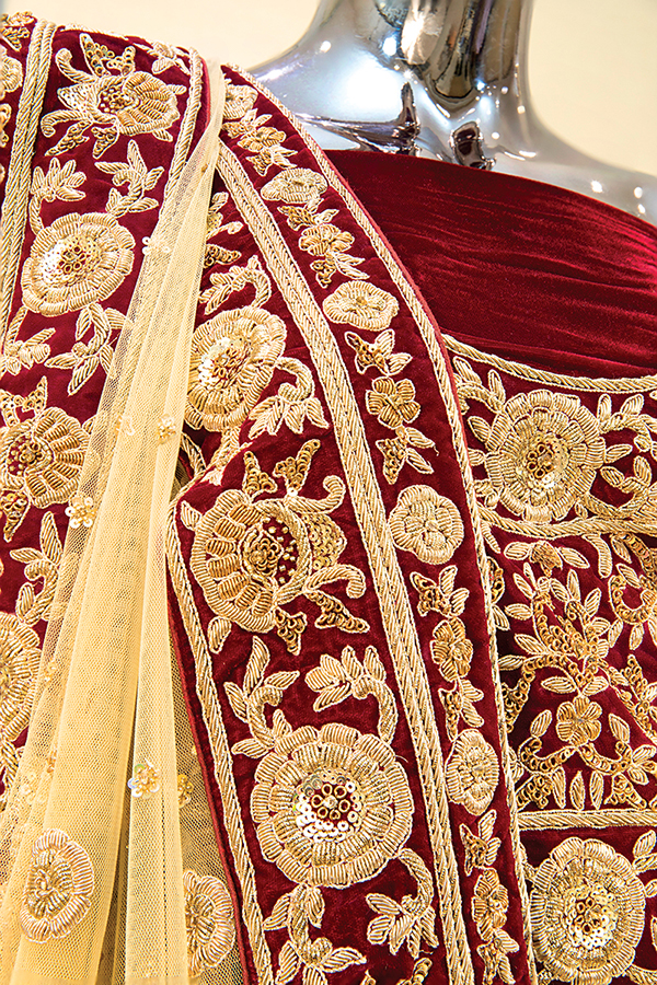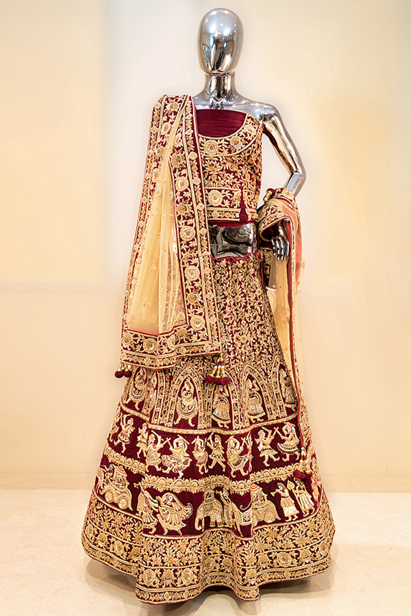Rich marron velvet lehenga with fine hand work in zardozi, dapka sequence and