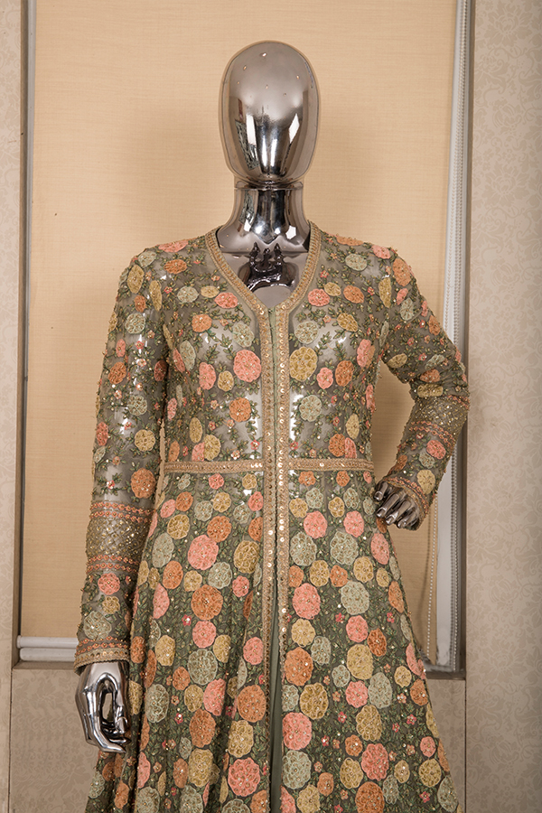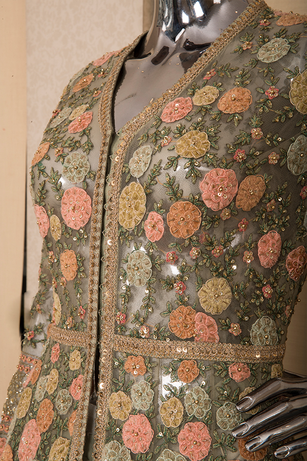 with pure zardozi borders and tonal chiffon skirt under it.