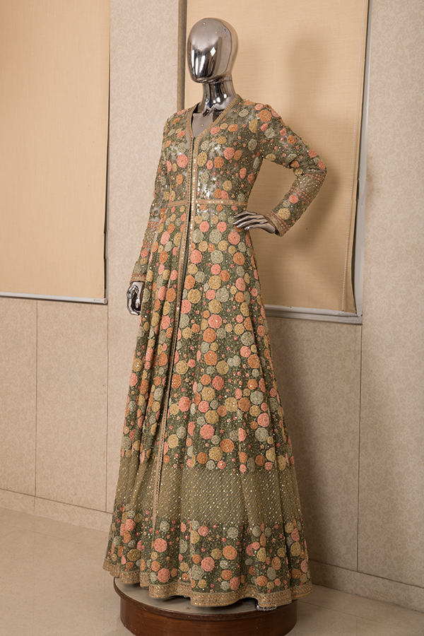 A beautiful multi colored fine velvet appliqued dress