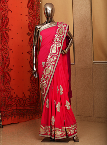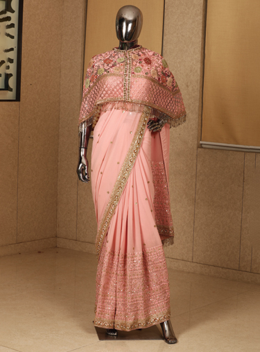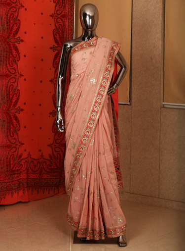 A beautiful pink pure georgette saree with self resham applique