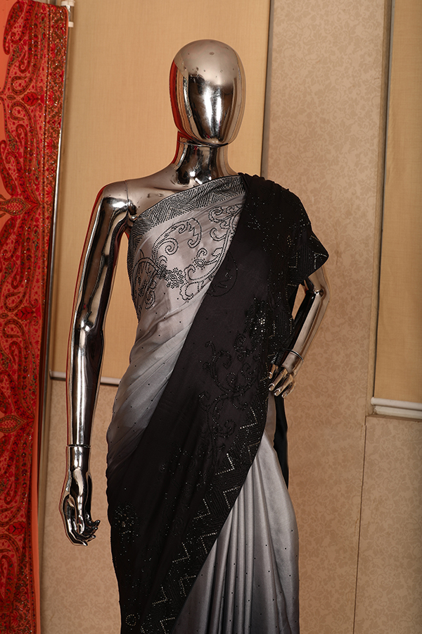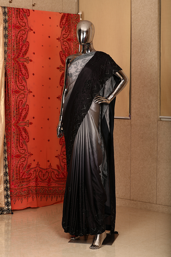 A pure satin georgette black grey ombre saree with fine