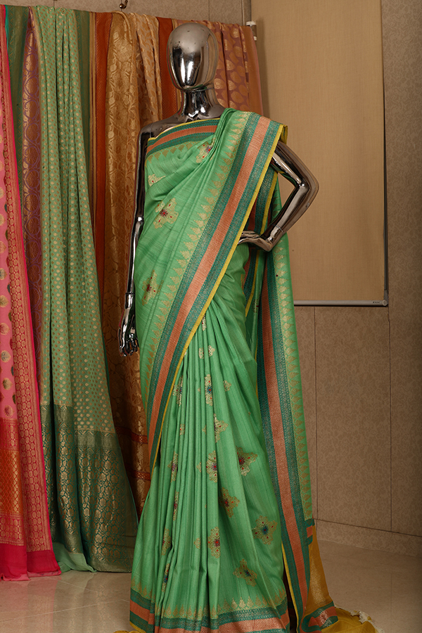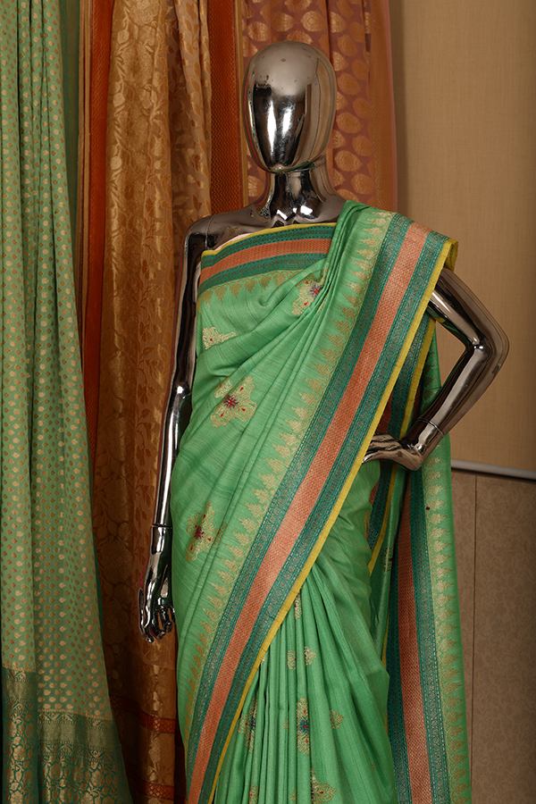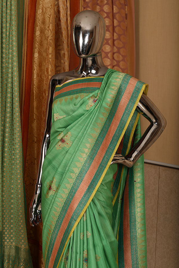 A gentle green pure handloomed tussar georgette saree colored with natural