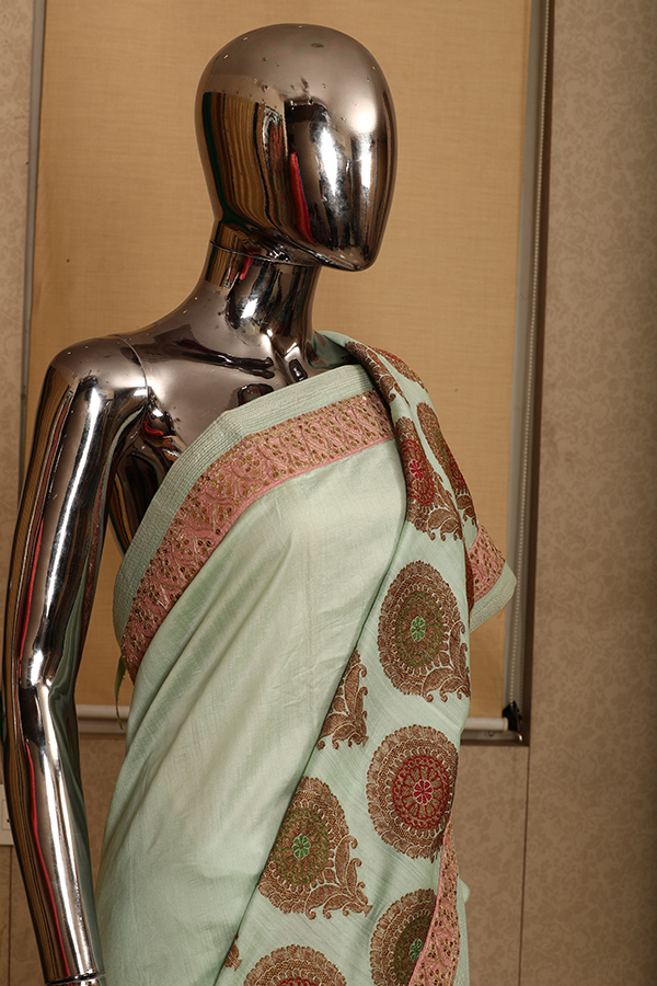 A light blue banarasi saree with multi colored woven motifs and