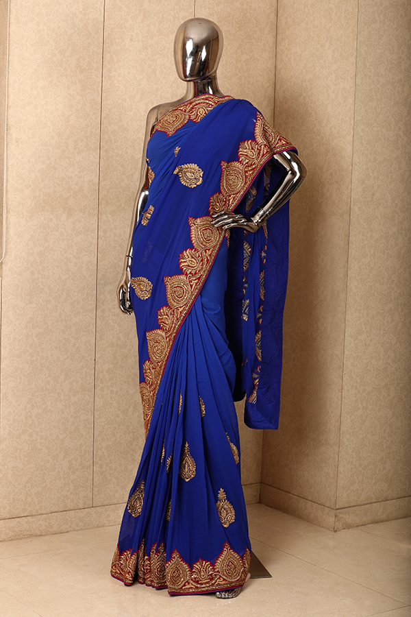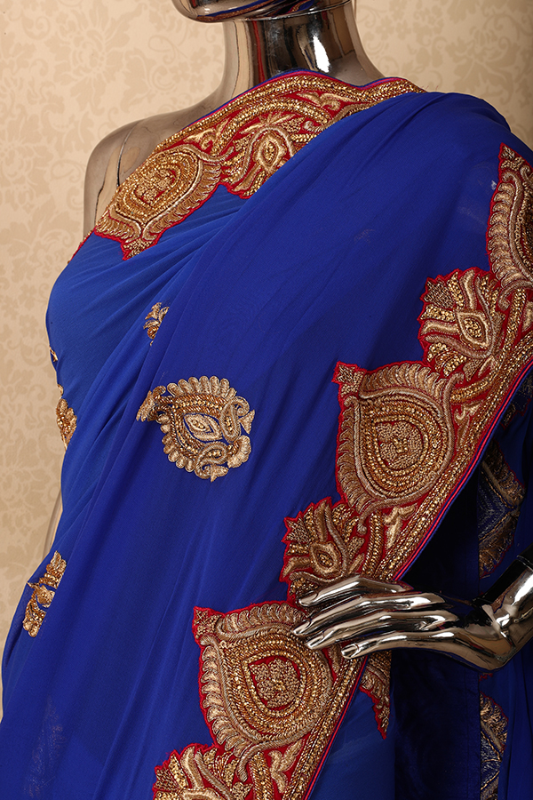A must have royal blue chiffon saree having big golden leaf motif on the body
