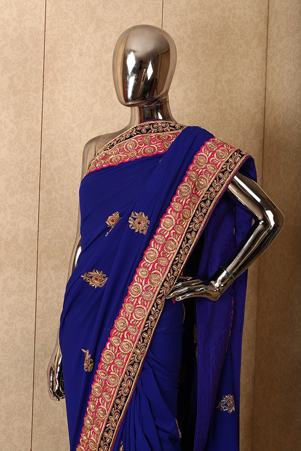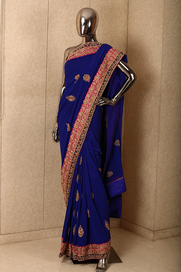 A dark royal blue chiffon saree beautified with thick border of light pink,