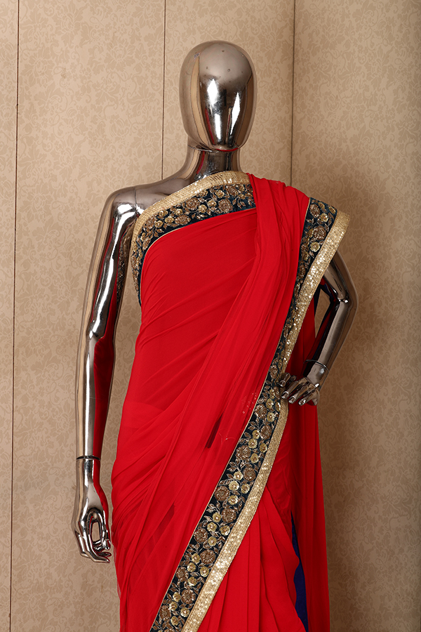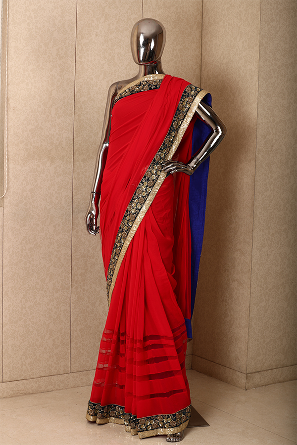 A plain blood neon red colored chiffon saree with highlight on the border. Small flowars in thred