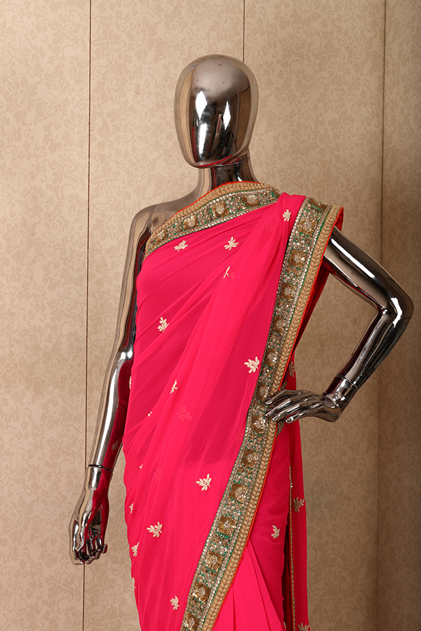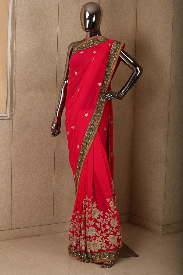 Get a classy look with this plain neon red chiffon saree. The bottom part is decorated with