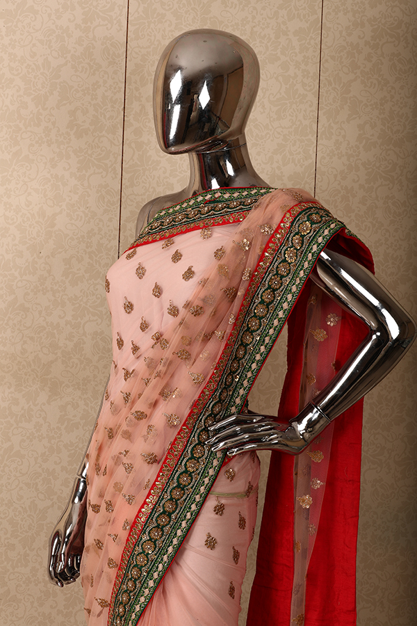 Perfect for any occasion a baby pink net saree is embelished with