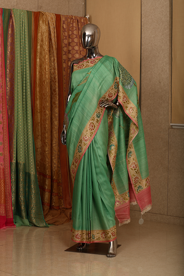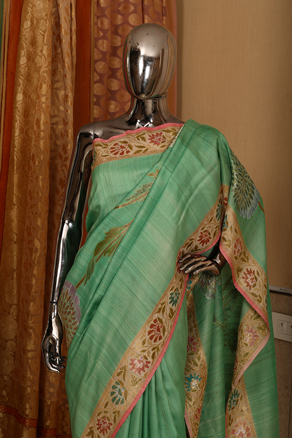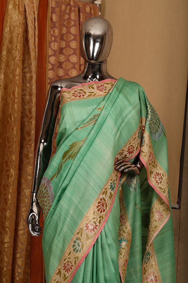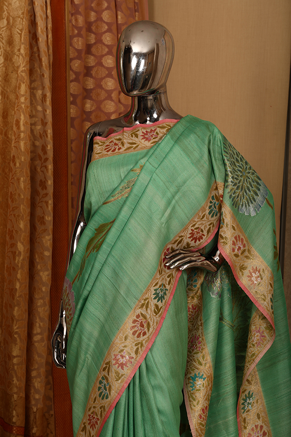 A dusty green pure banarasi handloom saree with beautiful sleeping