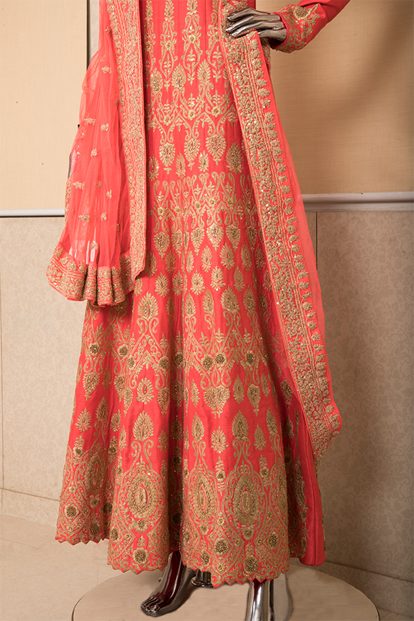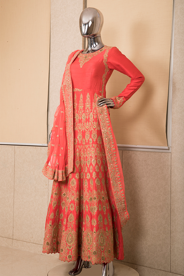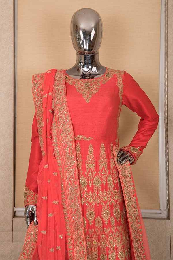 A burnt orange long anarkali suit of raw silk with embroidered zari thread work