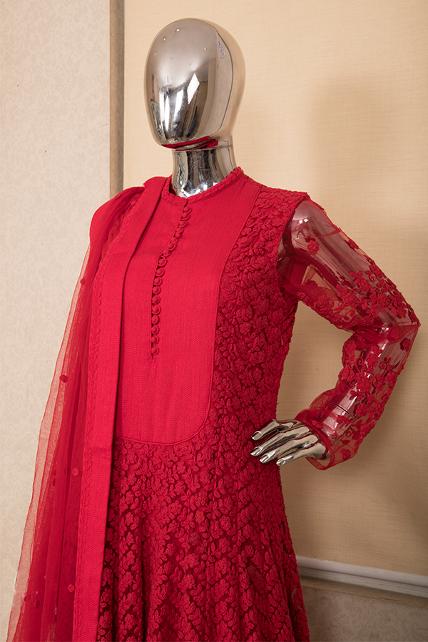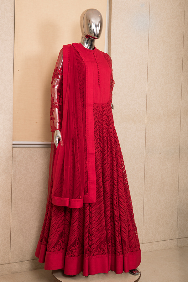 Aesthetically designed red long anarakali suit to match your beauty. Red appliqued