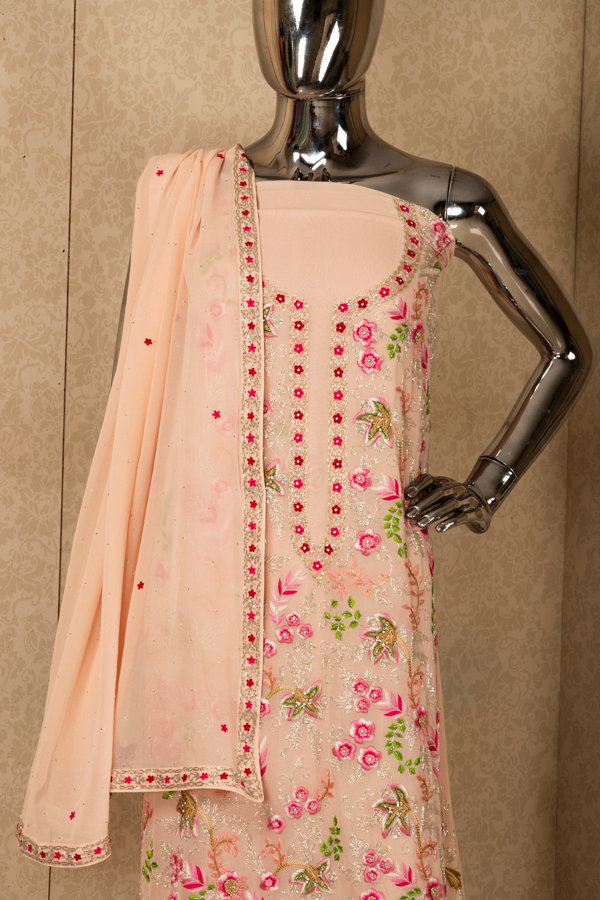 A baby pink color georgette long suit with multi colored thread work of flowers