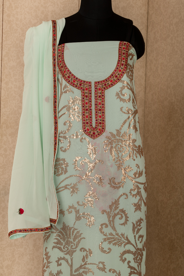 A light aqua blue color long suit with glitery golden color leaves all over body